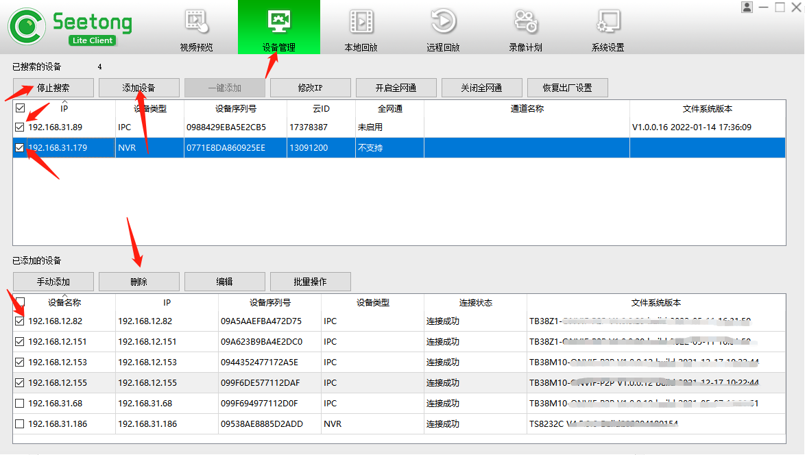 seetong電腦客戶端如何添刪除加攝像頭 2023年09月22日 1.初次運行客戶端,客戶端自動搜索添加局域網內設備 2.搜索到設備IP地址在前面勾選,點擊添加 3.勾選已添加設備,點擊刪除 設備管理--開始搜索--選擇設備--添加設備 設備管理--勾選設備--刪除 上一篇: Seetong電腦客戶端如何登錄本地遠程回放 >下一篇: seetong電腦客戶端如何遠程觀看 返回列表
